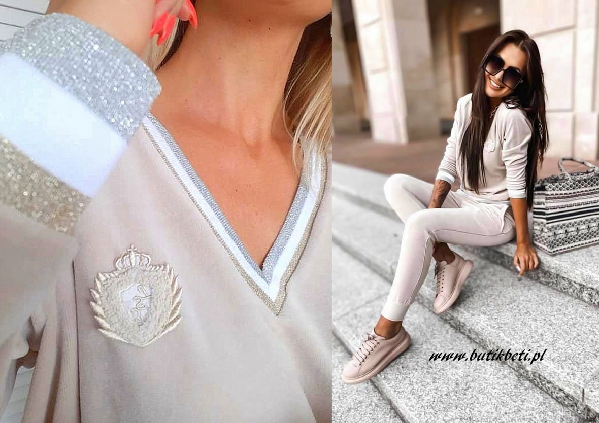 NIEZWYKLE ORYGINALNA I EKSKLUZYWNA bluza dresowa welurowa Polskiego Producenta LUISE w tonacji eleganckiego beżu z pięknymi złotymi dodatkami