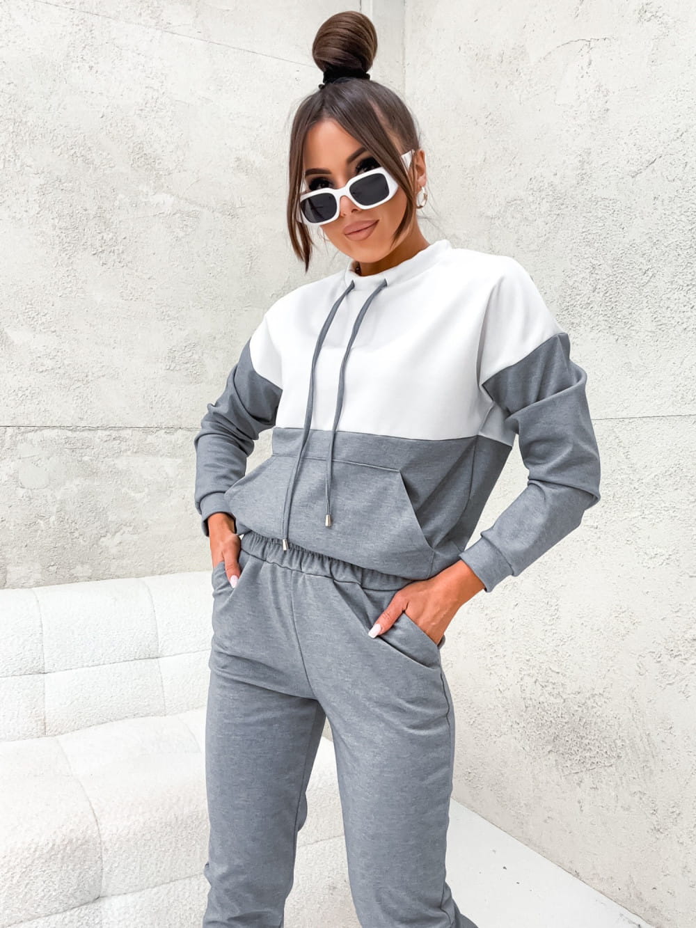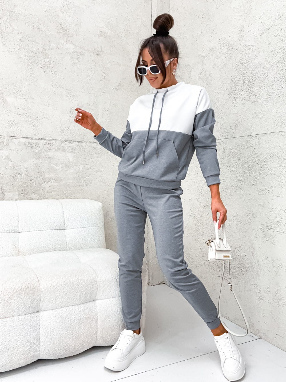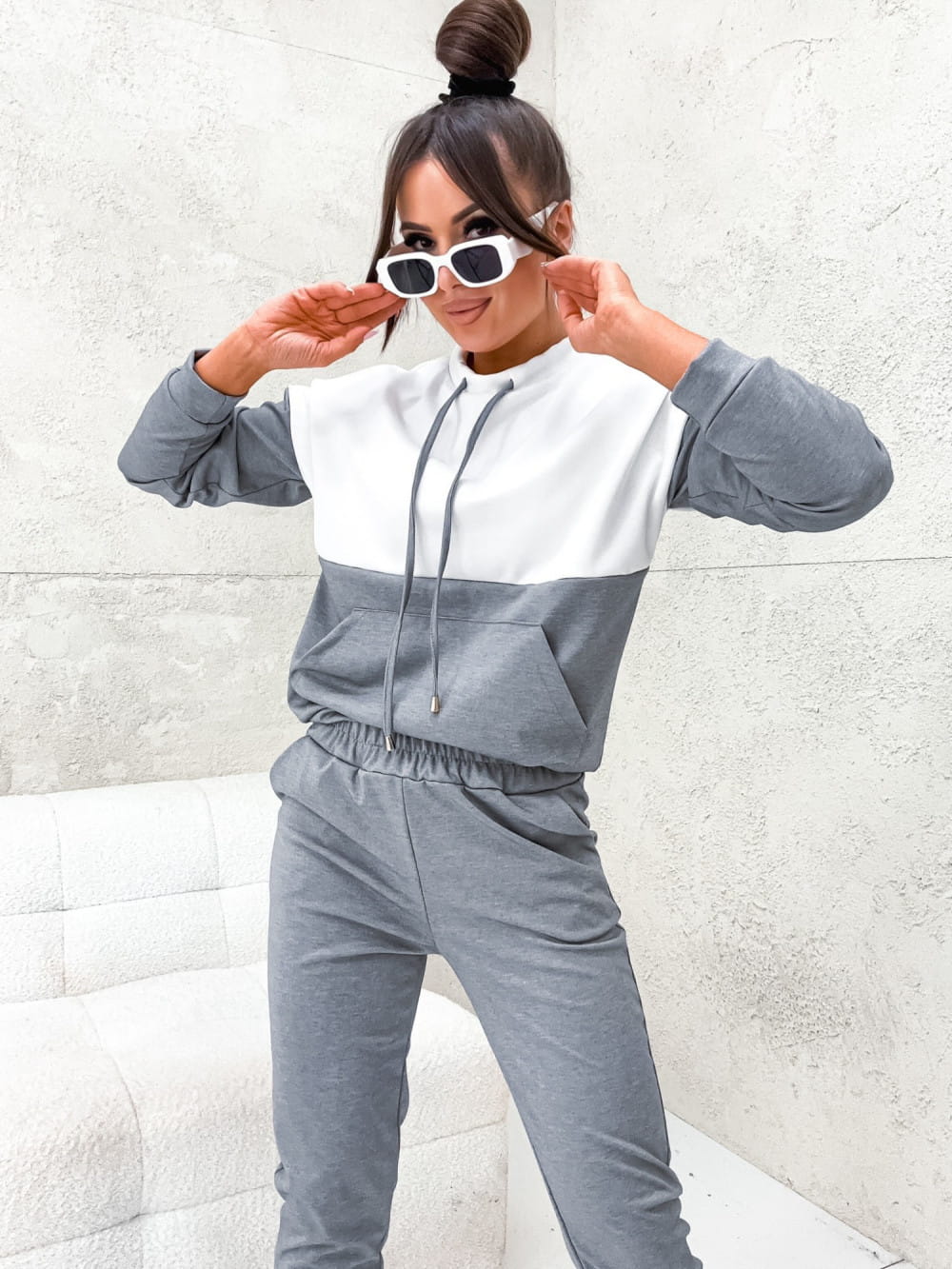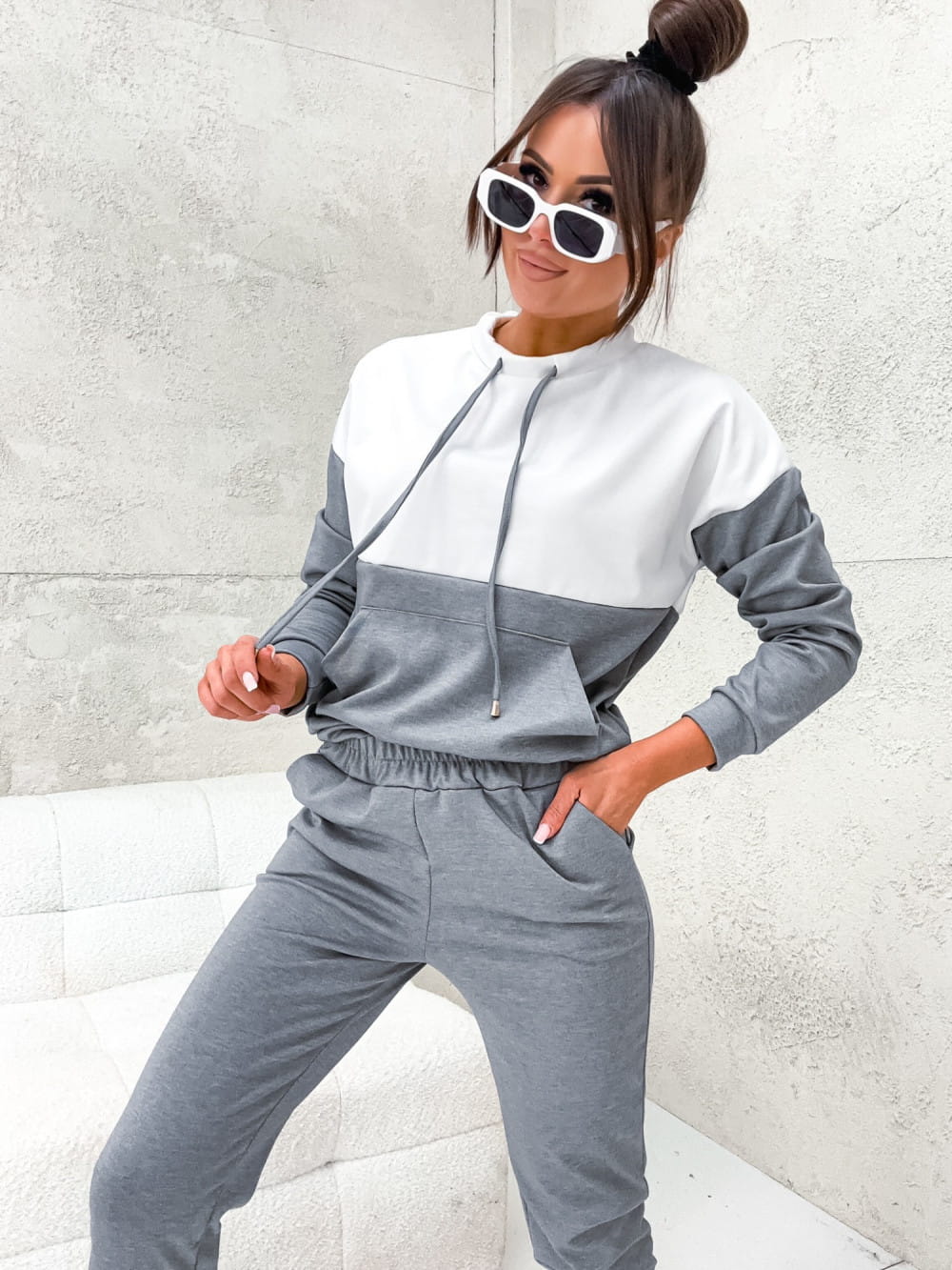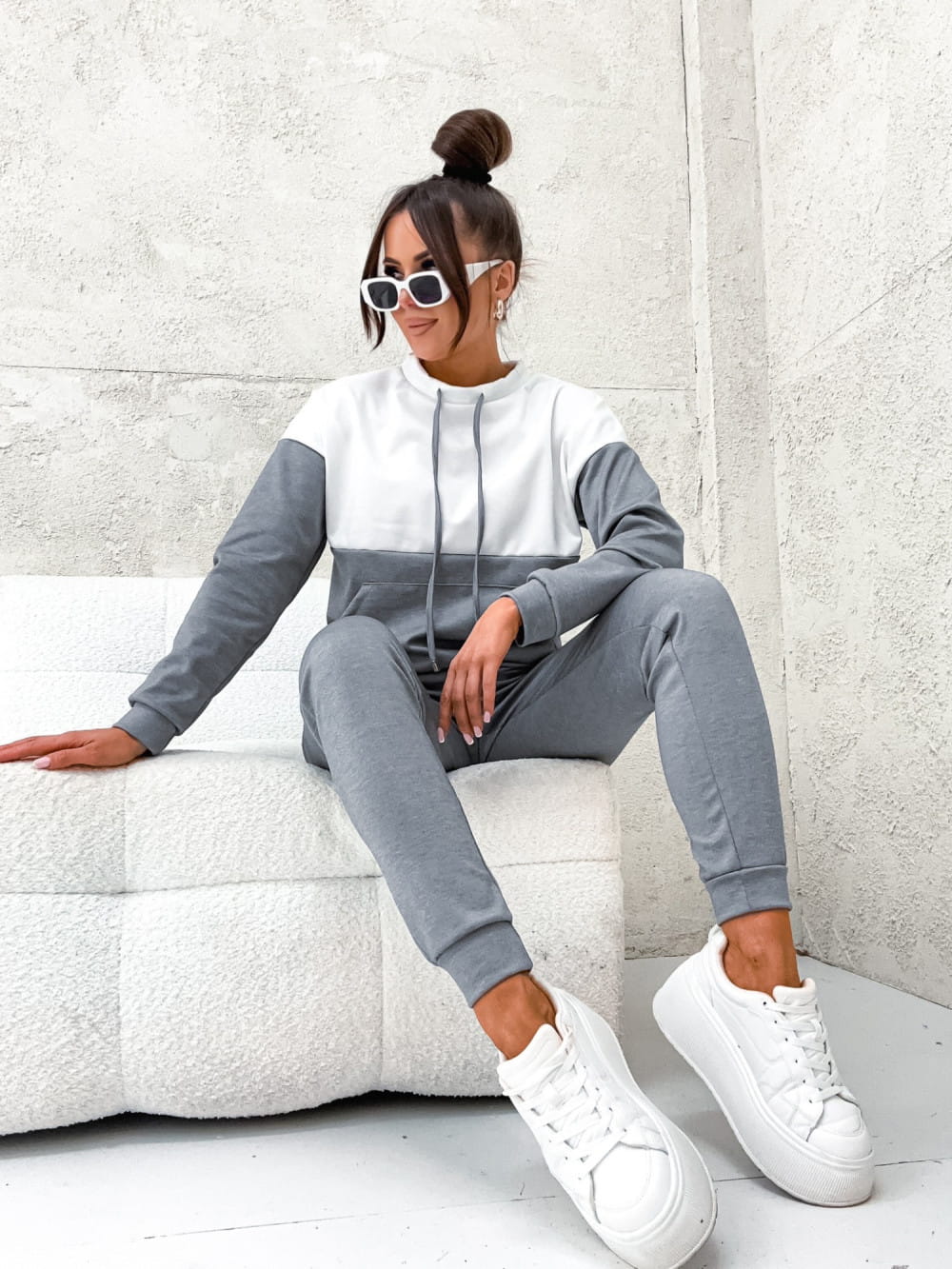 Komplet składa się z luźnej, wciąganej przez głowę bluzy ze ściągaczami i spodni na rozciągliwej gumce.