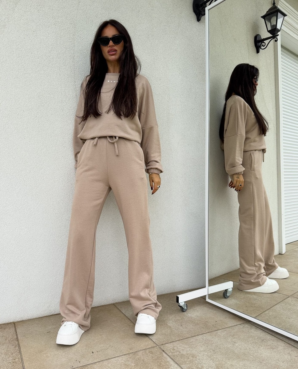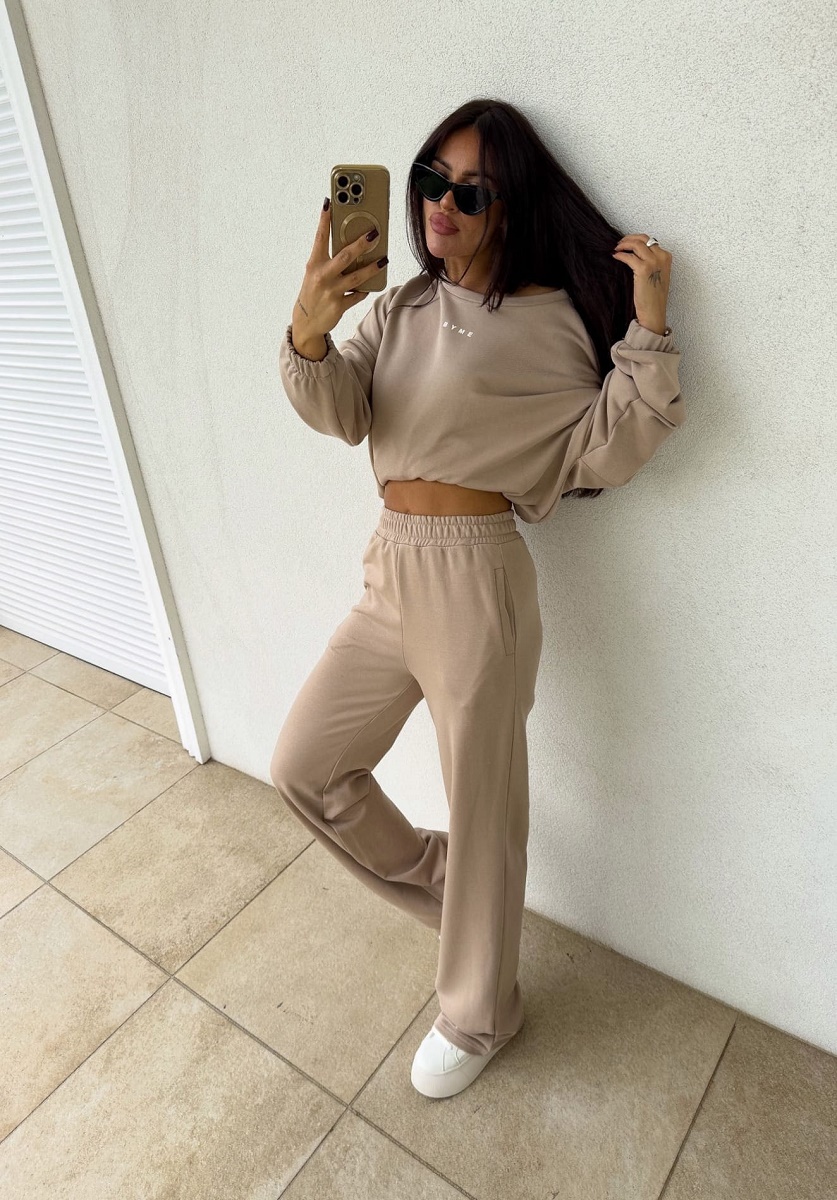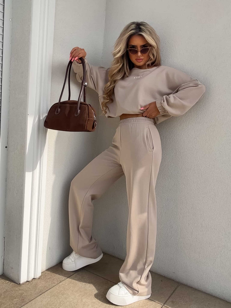 Komplet Sydney to wygodny zestaw składający się z bluzy i spodni, idealny na co dzień. Bluza ma prosty, luźny krój, który zapewnia swobodę ruchów, a długie rękawy zakończone gumą dodają jej charakteru. Dół bluzy wyposażony jest w troczek, który umożliwia regulację, zapewniając idealne dopasowanie do sylwetki. Spodnie w zestawie mają szeroki krój i gumkę w pasie, co gwarantuje komfort i elastyczność. Dzięki temu komplet jest niezwykle wygodny, a jednocześnie modny.