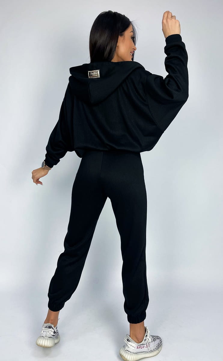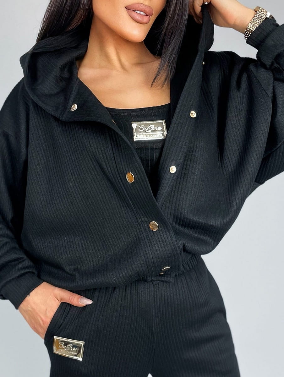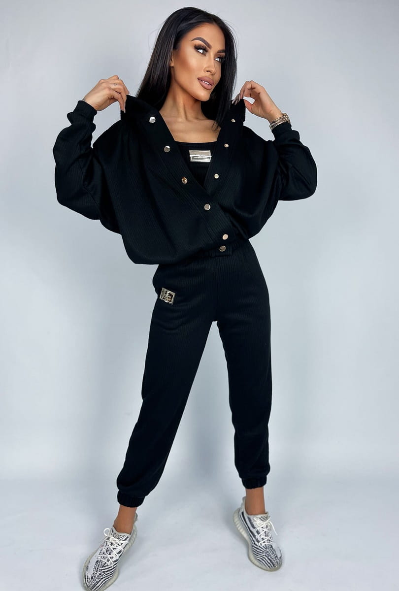 Trzyczęściowy komplet. Oversizowa bluza zapinana na napy z obszernym kapturem, spodnie o luźnym kroju oraz top