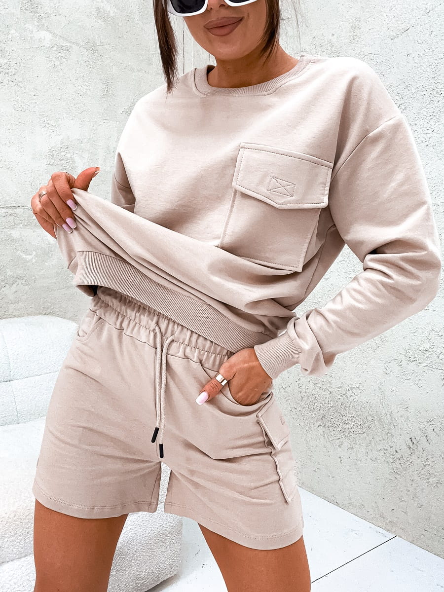 Komplet bawełniany składający się z bluzy i spodenek, który świetnie sprawdzi się na co dzień. Kieszonki umieszczone na spodenkach oraz gumka w pasie podkreślają sportowy charakter zestawu, natomiast przyjemny, średniej grubości materiał sprawia, że komplet jest niezwykle wygodny i jest idealną propozycją na lato. Bluza posiada długie rękawy oraz klasyczny, okrągły dekolt. Ten model to wspaniała opcja na wakacyjny wyjazd czy spacery.