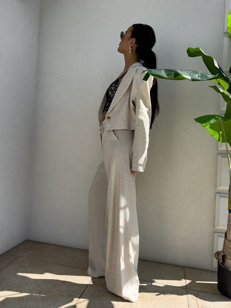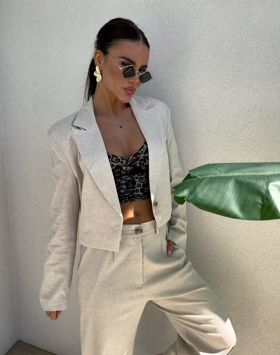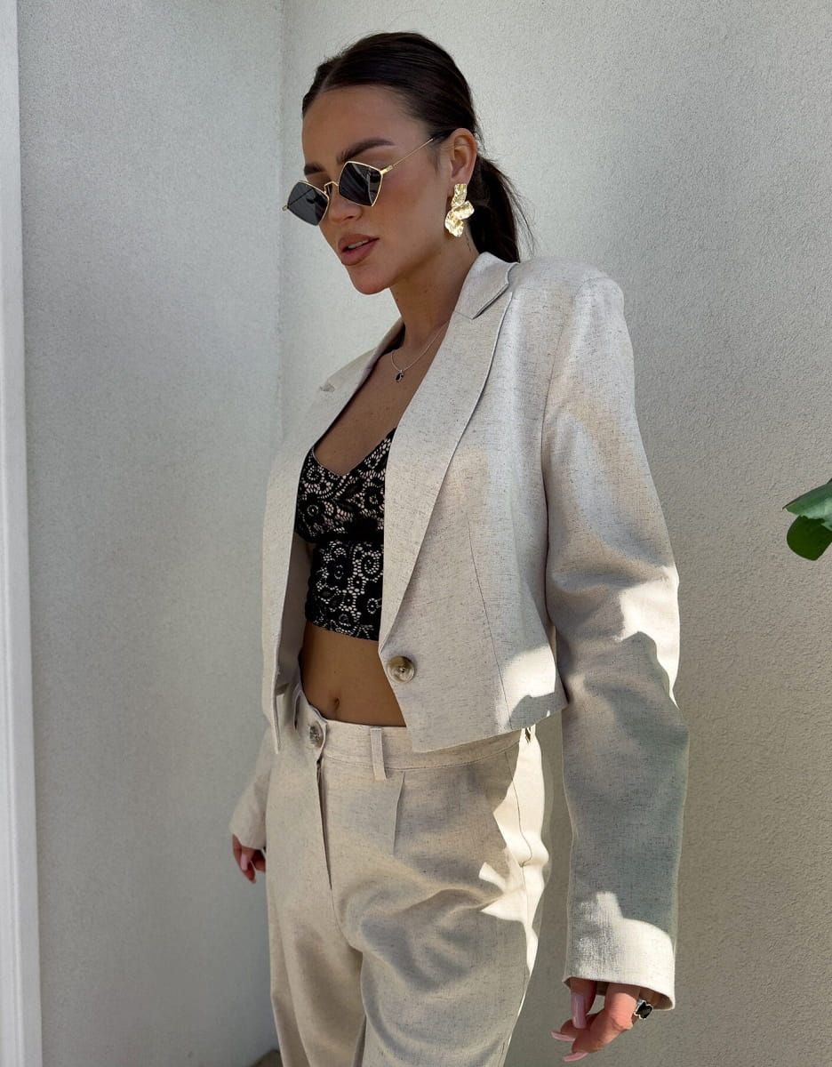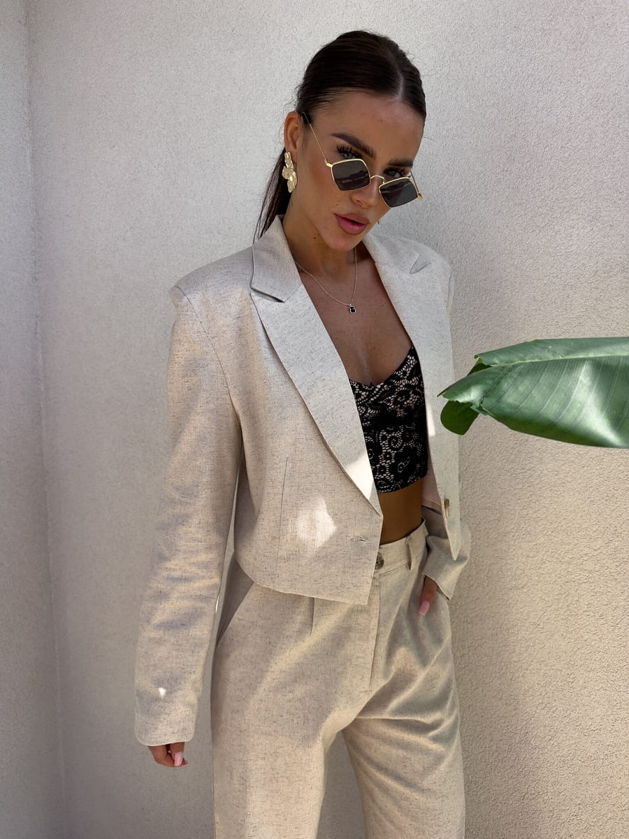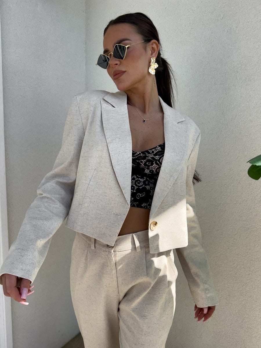 Marynarka o krótkim kroju, gładkie wykończenie. Marynarka posiada podszewkę, zapięcie regulowane przy pomocy guzika.