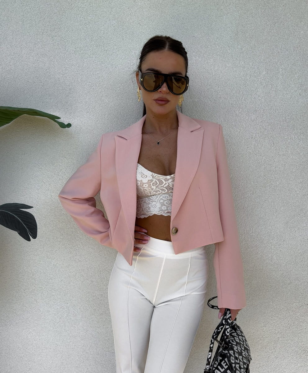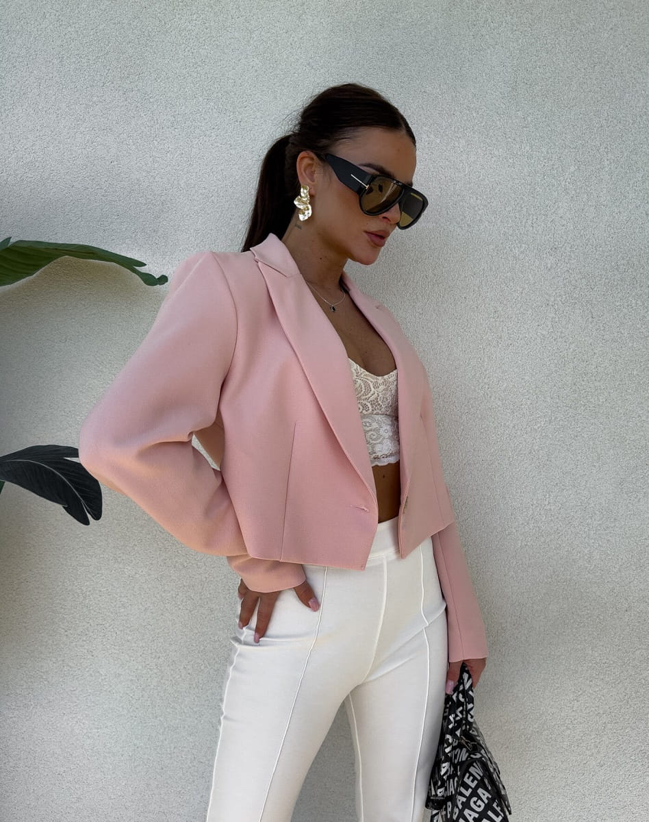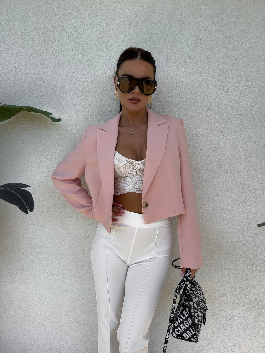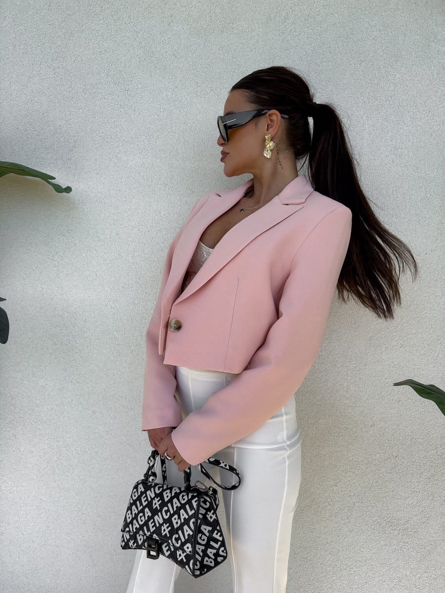 Marynarka o krótkim kroju, gładkie wykończenie. Marynarka posiada podszewkę, zapięcie regulowane przy pomocy guzika.
