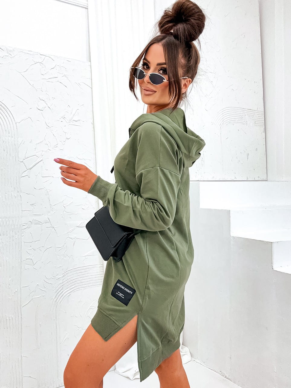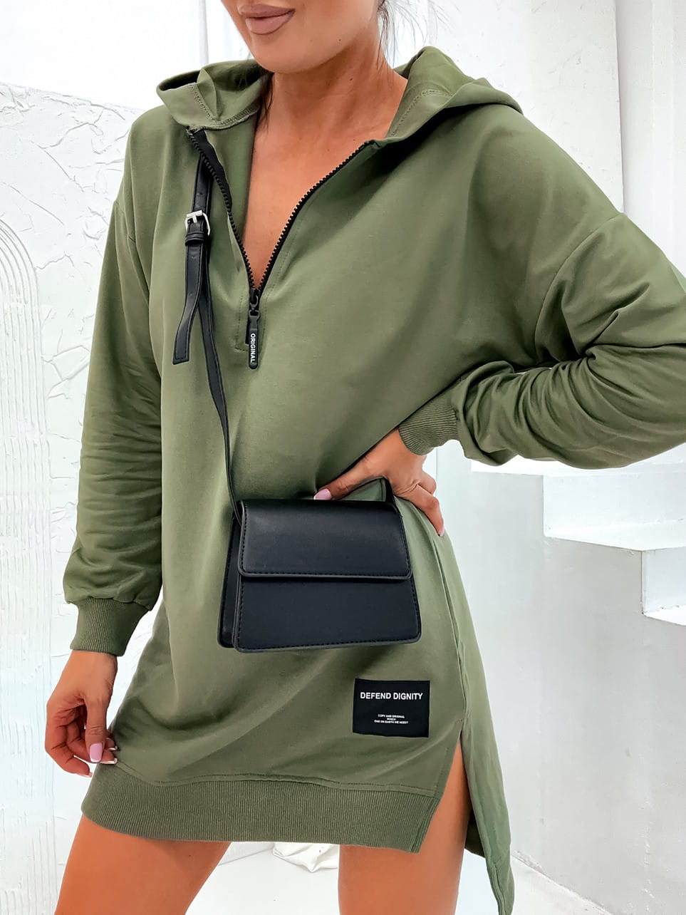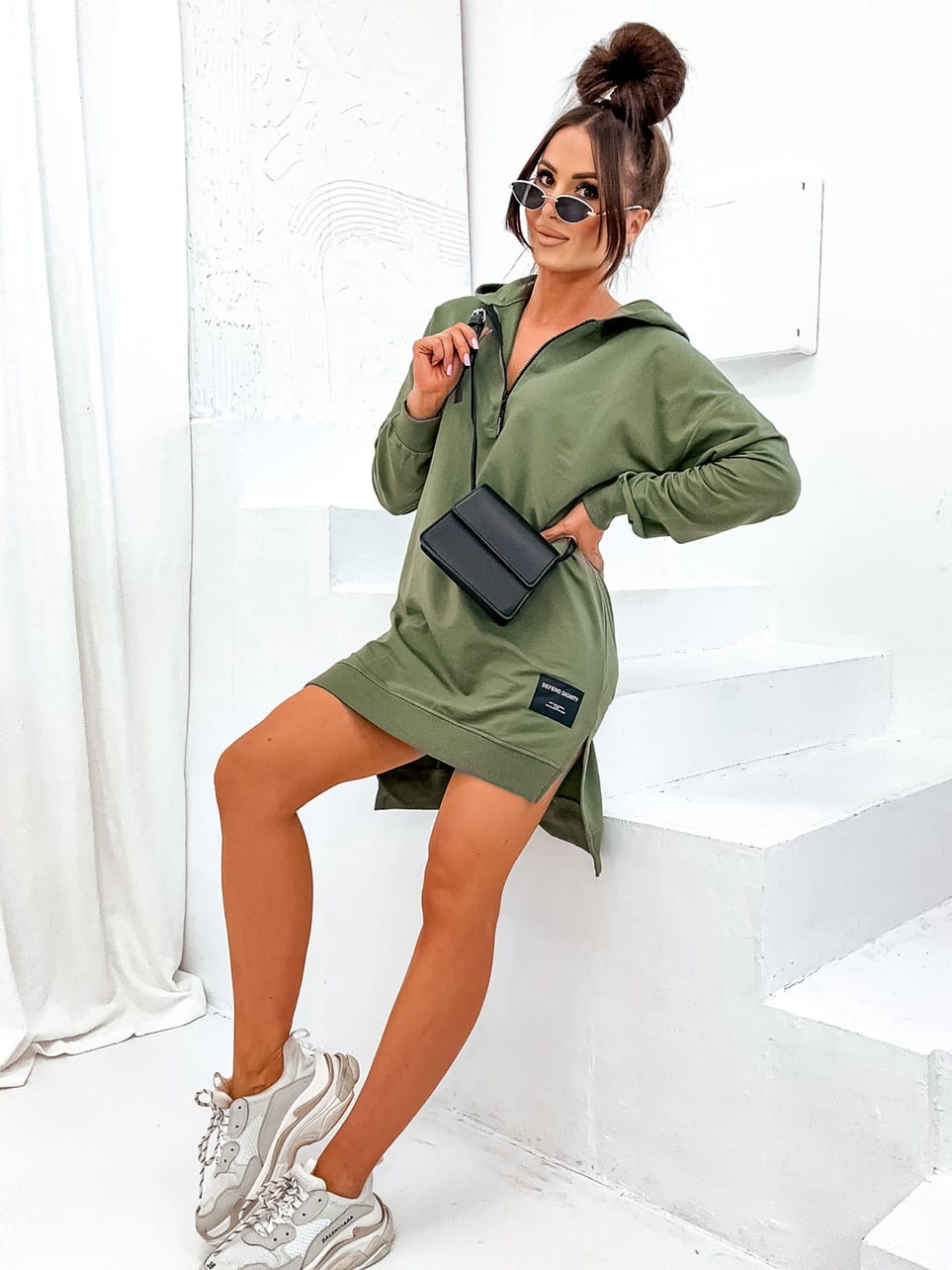 Bawełniana sukienka o luźnym kroju tuszująca wszelkie niedoskonałości. Niezwykle wygodna w noszeniu i świetnie skrojona. Sukienka posiada modny kaptur oraz wygodne kieszenie. Na dole naszyta mała ozdobna naszywka. Rękawy i dół sukienki wykończony ściągaczem. Przy dekolcie suwak. Idealna baza do wielu stylizacji