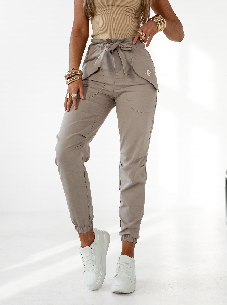 Spodnie damskie ZOYA – wysoki stan, wiązane w pasie, beżowe