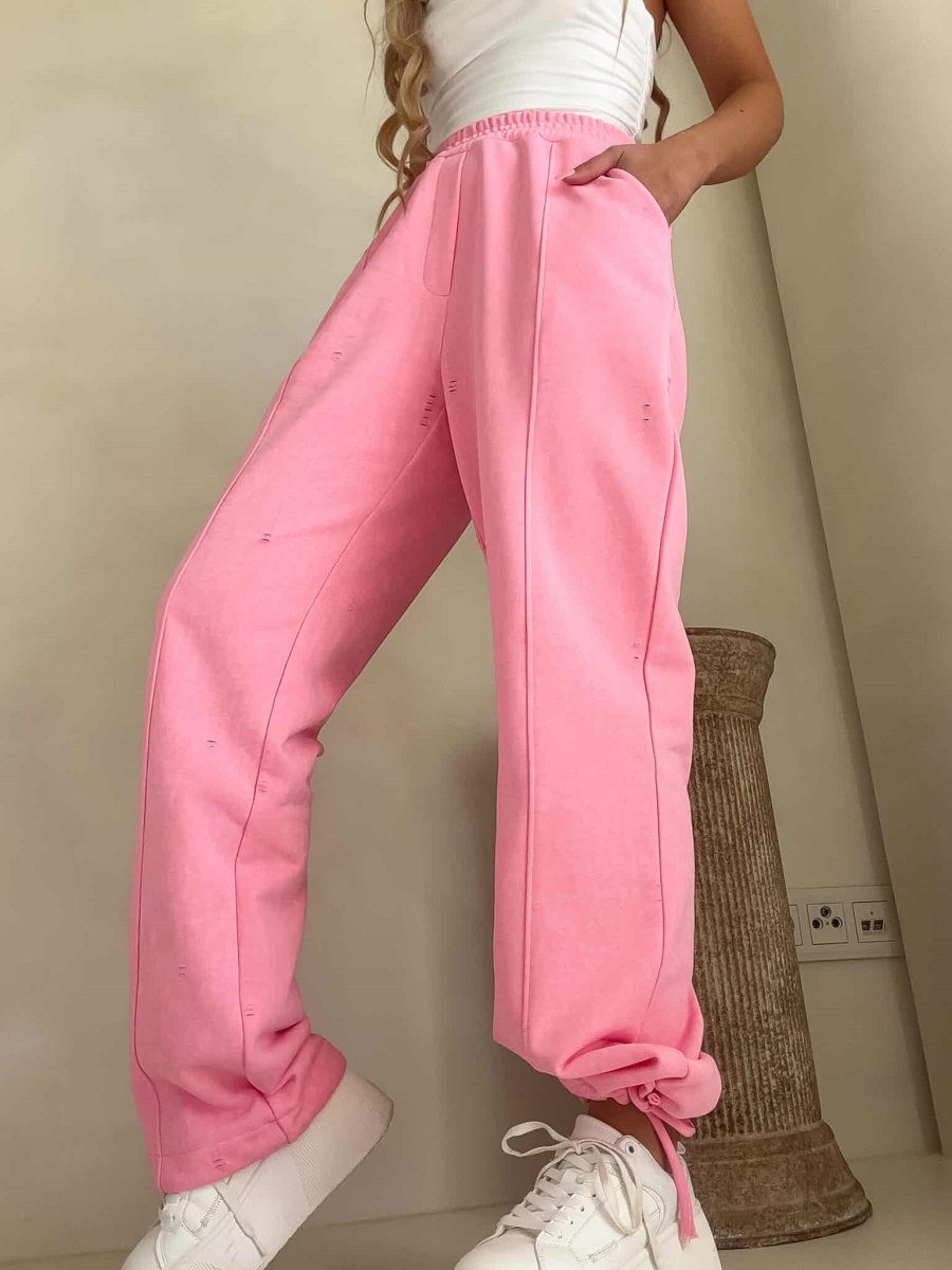 Model posiada elastyczną gumkę w pasie, dzięki czemu spodnie z wysokim stanem doskonale układają się na ciele i nie powodują ucisku. Szerokie nogawki zakończone ściągaczami umożliwiają regulację długości, co pozwala dopasować fason do własnych preferencji i stylizacji. Pionowe przeszycia z przodu optycznie wydłużają nogi, podkreślając sylwetkę. Dodatkowym atutem są modne przetarcia i subtelne dziurki, które nadają spodniom nowoczesnego, lekko streetwearowego charakteru.