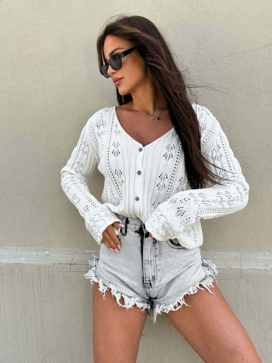 Ażurowy sweter z bawełny z dekoltem w serek Lekki i kobiecy sweter wykonany z wysokiej jakości 100% bawełny. Dzianina o wyrazistym, strukturalnym splocie z delikatnym ażurem subtelnie odsłania skórę, nadając całości romantycznego charakteru. Model wyróżnia się głębokim dekoltem w serek oraz rzędem drobnych, drewnianych guzików, które podkreślają jego naturalny styl. Luźny krój i miękki, oddychający materiał gwarantują wygodę noszenia przez cały dzień. Idealny na wiosenne spacery i chłodniejsze letnie wieczory — sweter, który sprawdzi się zarówno w codziennych, jak i bardziej stylizowanych zestawieniach.